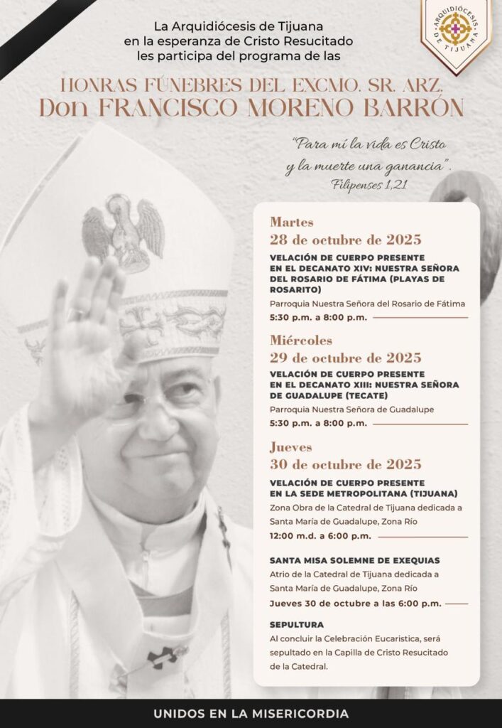 Tijuana, BC – La comunidad católica de Tijuana recibió con profundo pesar la noticia del fallecimiento del Arzobispo Monseñor Francisco Moreno Barrón, quien encabezó la Arquidiócesis durante los últimos nueve años y se convirtió en una figura clave de la vida religiosa y social de la región.