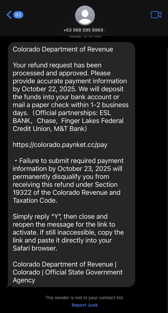 El Departamento de Ingresos de Colorado (DOR) lanzó una advertencia urgente a los residentes del estado tras detectar una nueva modalidad de estafa por mensajes de texto que busca robar información personal y bancaria de los contribuyentes.
